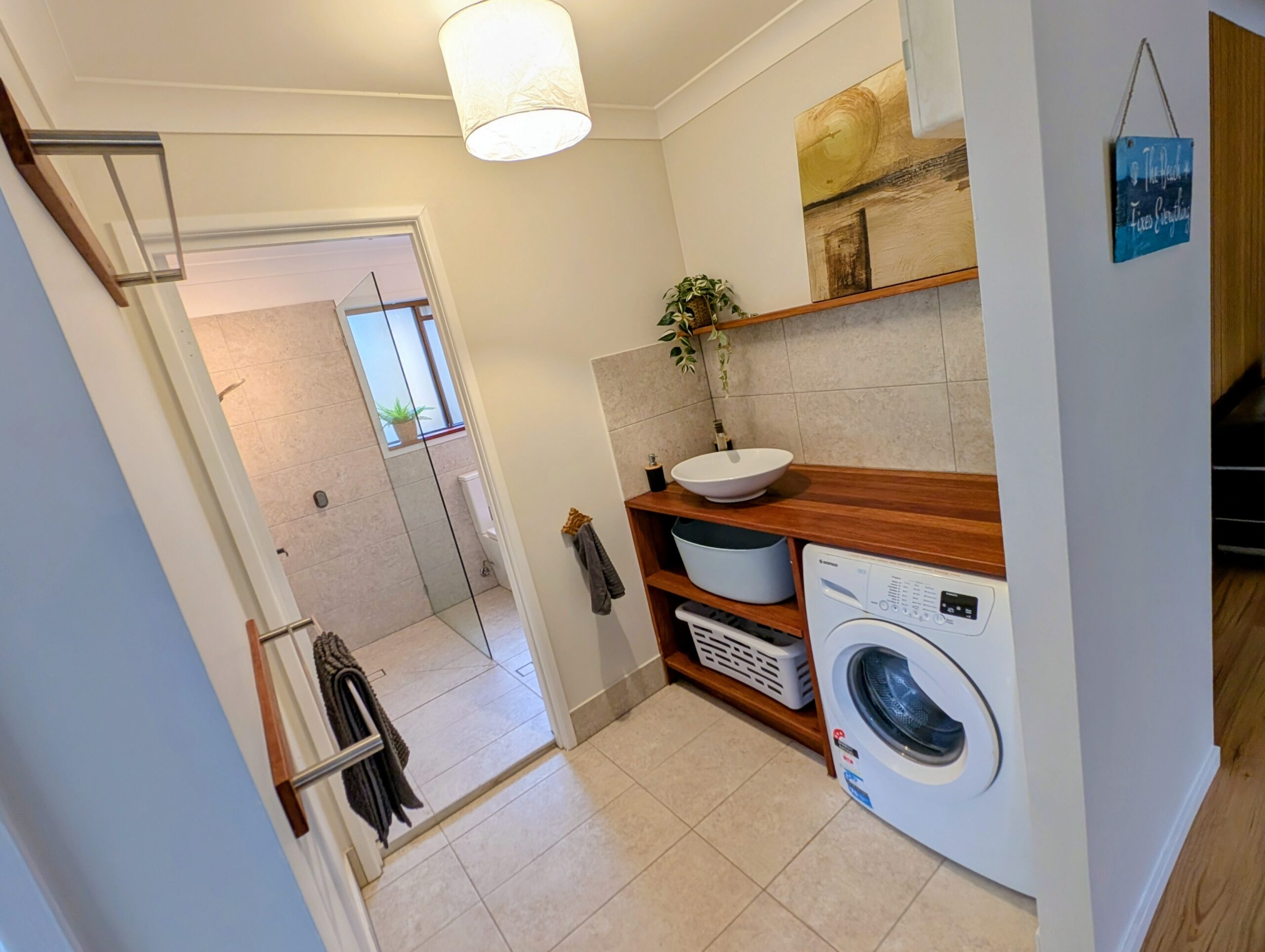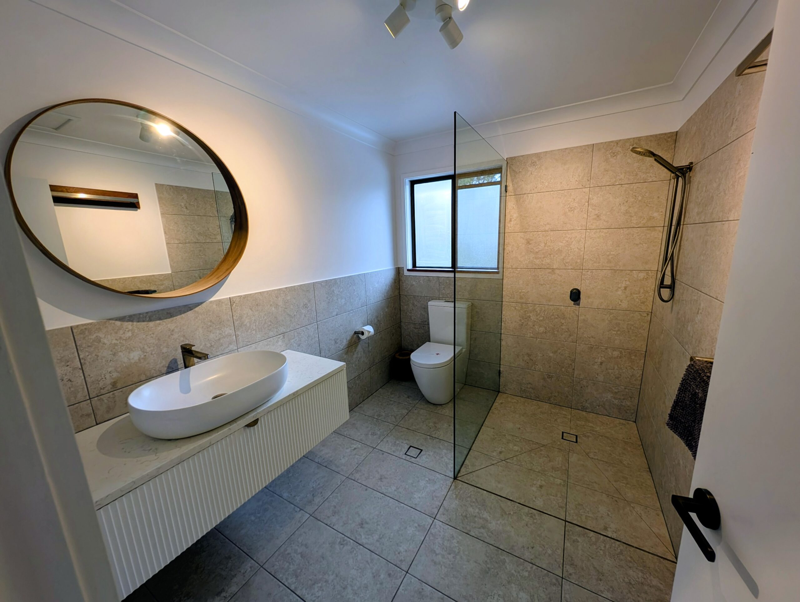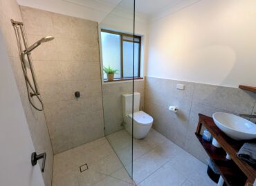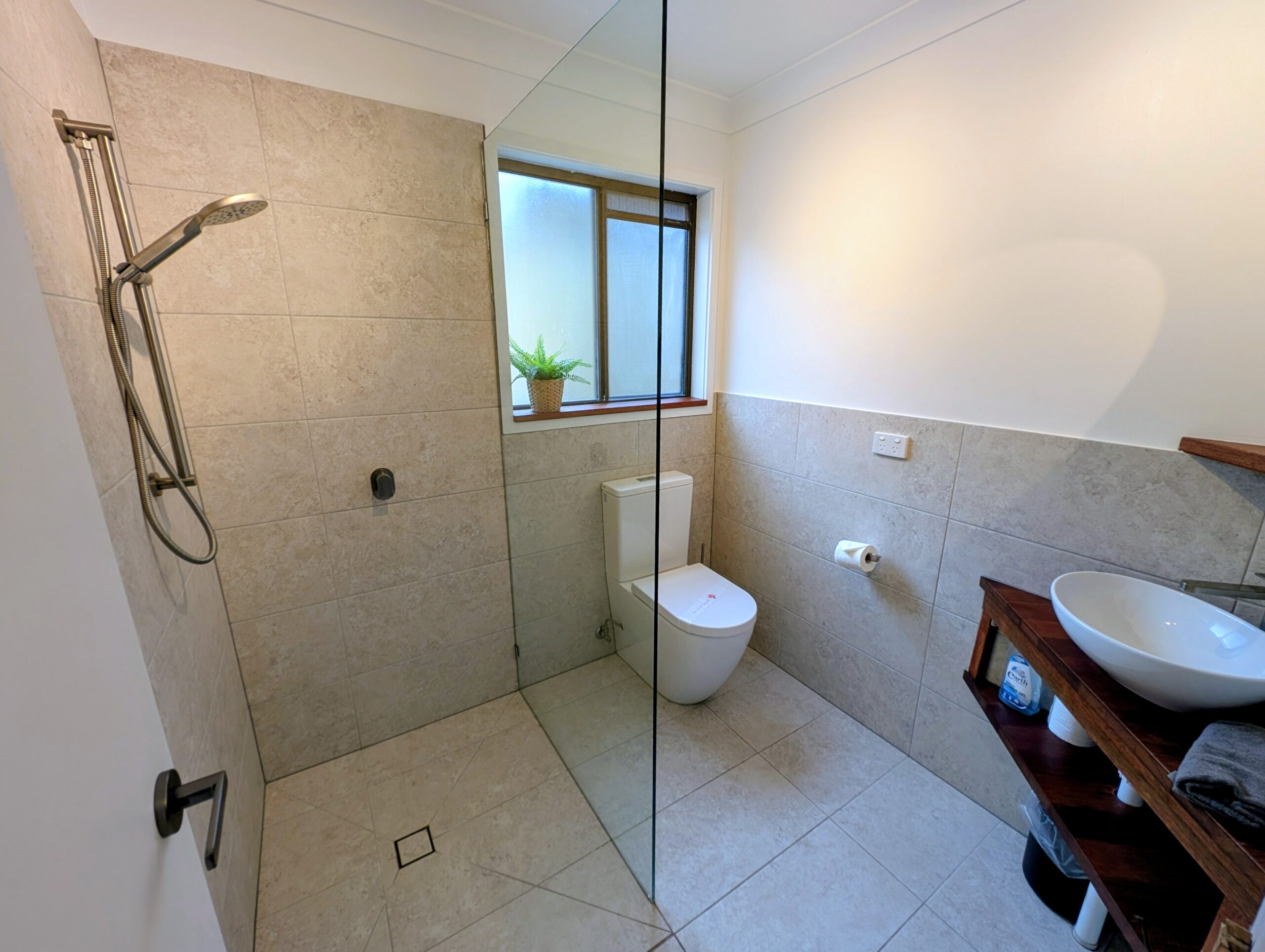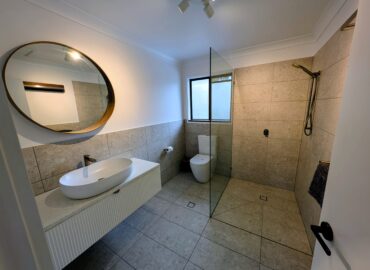 - Bathroom: shower, toilet, vanity.